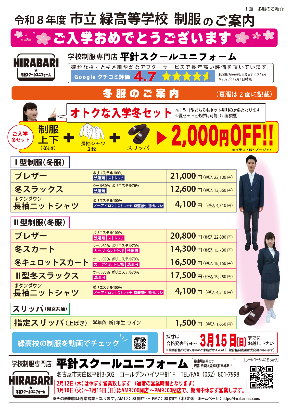 緑高校の制服は「平針スクールユニフォーム」に お任せ下さい。