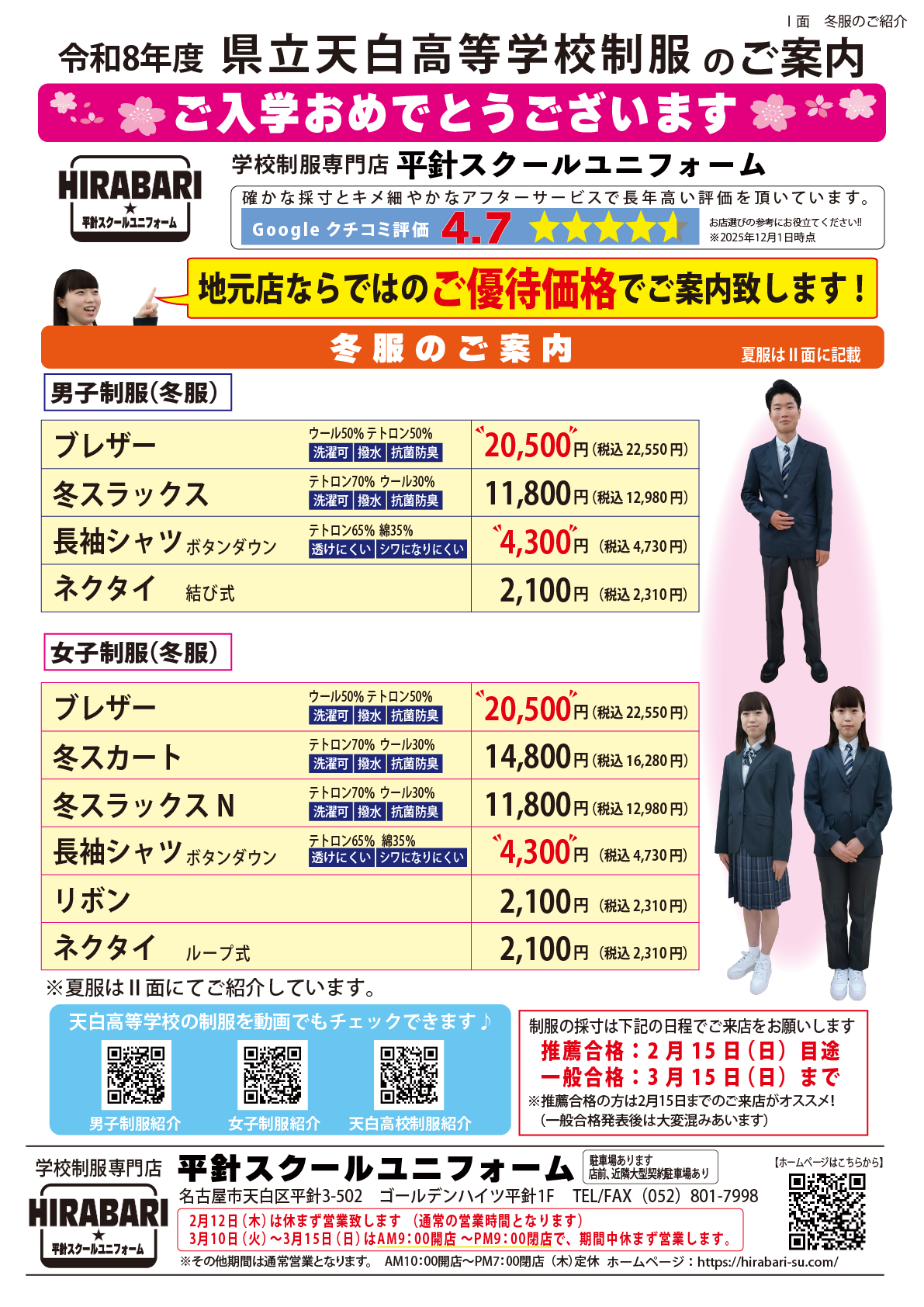 天白区平針にて「地元」制服専門店として、