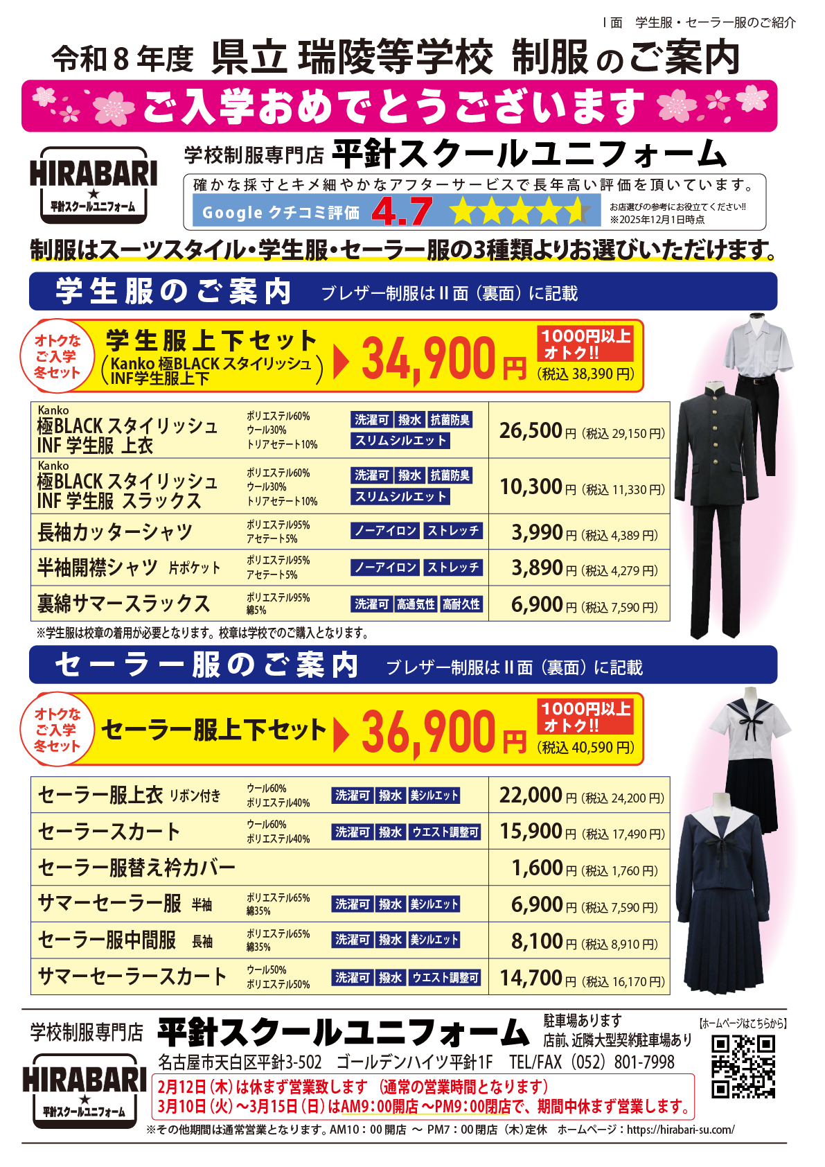 瑞陵高校の制服は「平針スクールユニフォーム」に お任せ下さい。